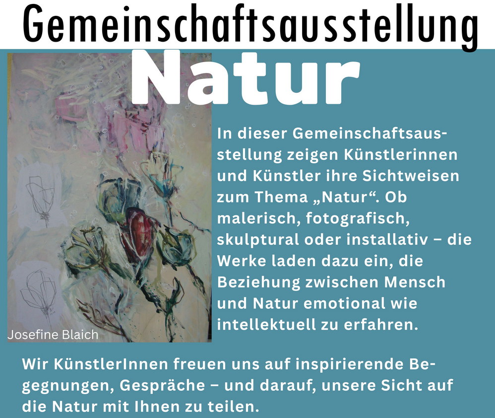 Am Freitag, dem 5. September 2025, wird um 19 Uhr im KunstRaum Feldkirchen mit einer Vernissage die Gemeinschaftsausstellung "Natur" eröffnet.